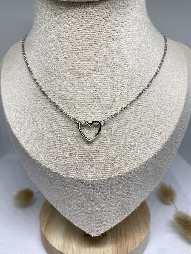 Collier en acier inoxydable, avec un cœur cranté, inspiré de la forme d’un nuage.