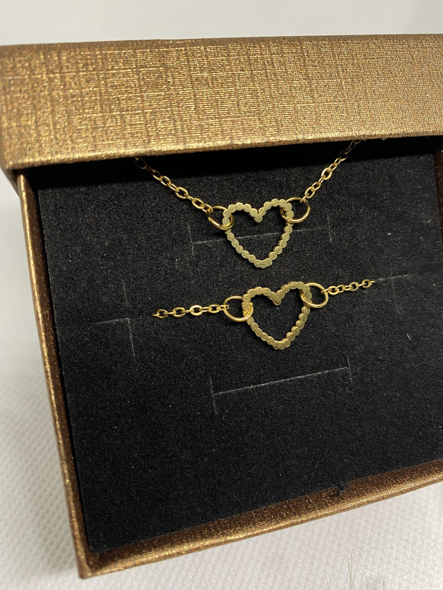 Coffret composé d’un collier et d’un bracelet dorés en acier inoxydable, avec un cœur cranté.